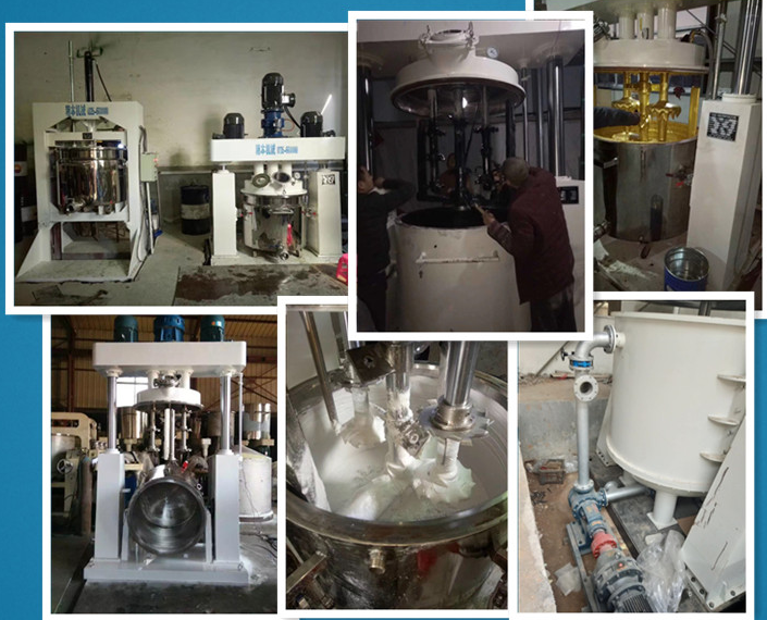 是一種多功能、強(qiáng)制性攪拌機(jī),釜內(nèi)有三根不同形式的攪拌器,其中一根低速攪拌器在繞釜體軸線轉(zhuǎn)動(dòng),其余兩根高速攪拌裝置又以不同的轉(zhuǎn)速繞自身軸線高速自轉(zhuǎn),使物料在釜內(nèi)作復(fù)雜的運(yùn)動(dòng),受到強(qiáng)烈的剪切和混合。設(shè)備內(nèi)山形刮壁刀繞釜體軸線轉(zhuǎn)動(dòng),將粘在壁上和底部的原料刮出參與混合,使其效果更為理想。設(shè)備密封性好,可電加熱(水冷卻)抽真空,具有良好的排氣除泡。強(qiáng)力分散機(jī)缸蓋可液壓升降,缸體可自由移動(dòng),操作十分方便。強(qiáng)力分散機(jī)攪拌器的形式,根據(jù)物料要求可為多層槳葉式、框式、蝴蝶式、葉輪式等。攪拌機(jī)通常配套系列液壓擠出機(jī),以實(shí)現(xiàn)膏狀物料的擠出。